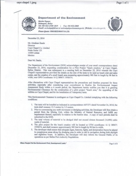 Recent reports of a beach project on Caye Chapel has raised concerns among government officials and the tourism sector, as it has started without the benefit of an Environmental Impact Assessment (EIA). Caye Chapel is an exclusive property being touted as on its way to becoming a world-class golf course. It has been revealed that developers are planning to create a beach area measuring 985 feet long by 98 feet wide, along with a beach club and a sales center. Stakeholders’ main concern is that the project was given clearance by the Department of Environment (DOE), ignoring the Supreme Court’s guidelines when handling these types of projects.