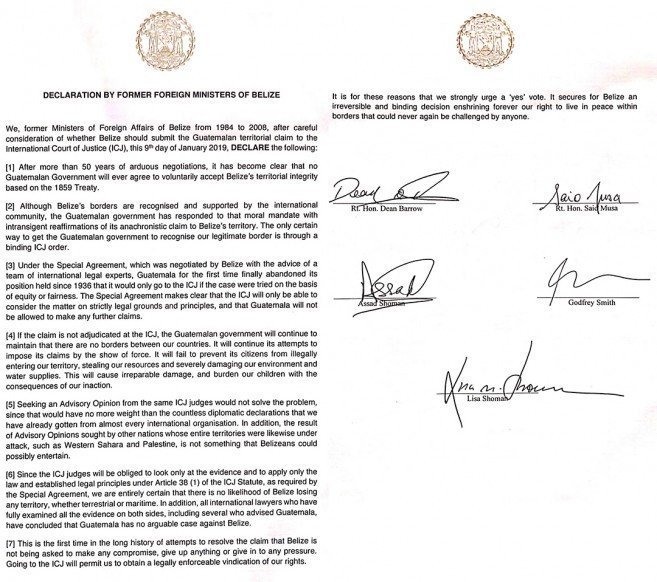 Four former Peoples United Party (PUP) Foreign Ministers have issued a joint declaration along with Prime Minister Hon. Dean Barrow outlining seven bullet points on which they urged a Yes vote to take the Belize Guatemala territorial dispute to the International Court of Justice (ICJ).