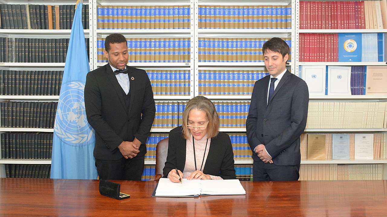Ambassador Young was accompanied by Mr. Andrew Smith, First Secretary at the Permanent Mission of Belize to the United Nations. The United Nations was represented by Mr. David K. Nanopoulos, Acting Chief, Treaty Section, Office of Legal Affairs.