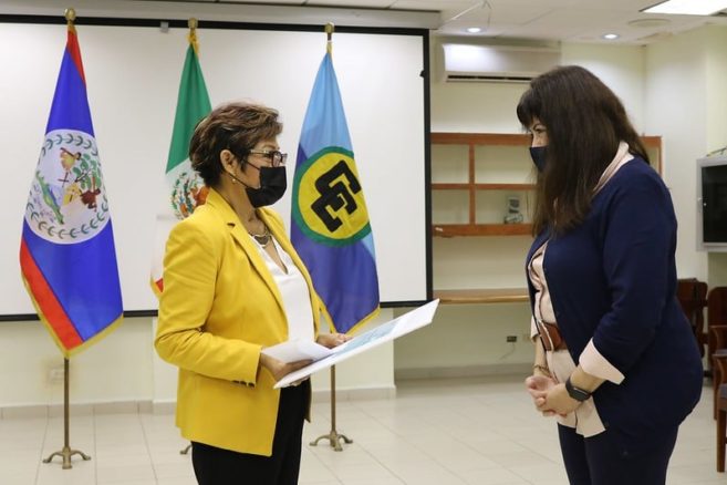 On December 18, 2020, the Ministry of Foreign Affairs, through Chief Executive Officer, Ambassador Amalia Mai, received a cheque for BZ$59,584.39 from Mexico’s Ambassador to Belize, H.E. Ms. Martha Ofelia Zamarripa Rivas.
