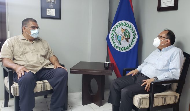Hon. Florencio Marin, Minister of National Defence and Border Security received a courtesy visit from Guatemala’s Ambassador to Belize, H.E. Edwin Rudy Archila Falla, at the Curl Thompson Building, Belmopan.