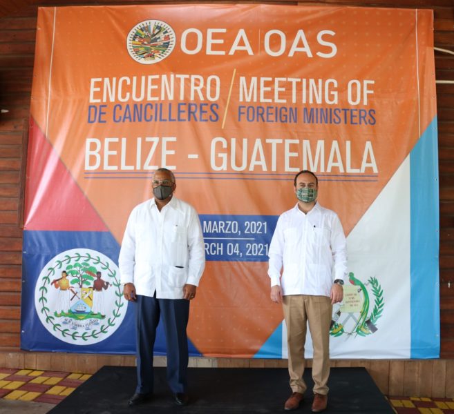 Hon. Eamon Courtenay, Minister of Foreign Affairs, Foreign Trade and Immigration of Belize, and H.E. Pedro Brolo Vila, Minister of Foreign Affairs of the Republic of Guatemala, met on March 4, 2021 at the Office of the Organization of American States (OAS) in the Adjacency Zone. It was the first meeting between the two foreign ministers since they assumed their respective posts.