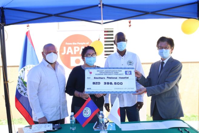 On March 11, 2021, Hon. Michel Chebat, Minister of Health and Wellness, along with Dr. Franelda Guitterez, Regional Health Manager, Southern Regional Health, received a grant cheque of BZ$398,500 from the Ambassador of Japan, H.E. Kazuhiro Iryu.