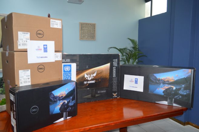 On Tuesday, 20 April 2021, the Ministry of Home Affairs & New Growth Industries received US$15,205 worth of Information Communication Technology (ICT) Equipment, including a high-powered Dell server, 3 Dell workstations, with high-quality monitors, procured under the USAID-funded “Evidence-Based Information Management for Citizen Security in Central America and the Dominican Republic” Project (also known as the InfoSegura Project).