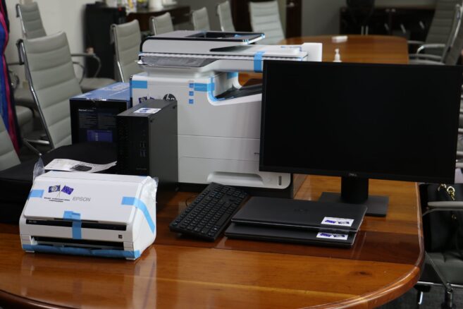 In the context of the Public Finance Management Programme under the 11th European Development Fund, 100 IT devices, including laptops, desktop computers, servers, and scanners, were donated to the offices of the accountant general, contractor general, auditor general and Ministry of Finance. The equipment is valued at over US$100,000.