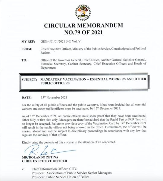 As the country continues to traverse the bumpy COVID-19 road, the Government of Belize (GOB) has introduced another measure to combat the virus and protect the Belizean people. On October 15th, a memo was issued from the Ministry of Public Service, Constitutional and Political Reform titled ‘Mandatory Vaccination.’ The notice stated that all essential workers and public officers must be vaccinated by December 15, 2021.