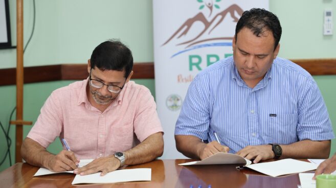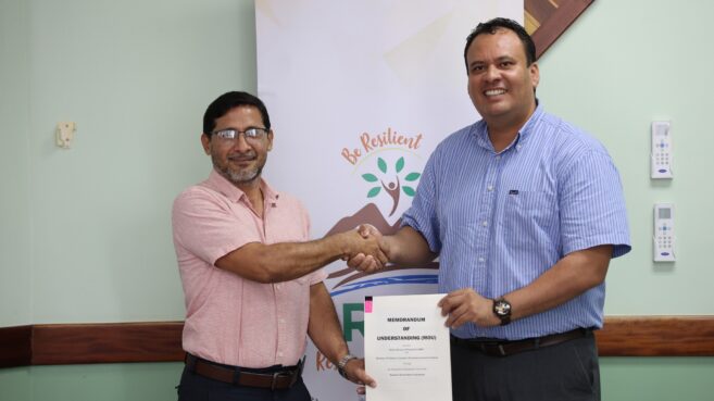 CEO Dr. Osmond Martinez and Mr. Jose Trejo, Director of BBS, signed the MOU on behalf of their respective organizations. The MOU was witnessed by Dr. Geraldo Flowers, Program Manager for Resilient Rural Belize, and Mr. Lloyd Orellano, Standards Officer.