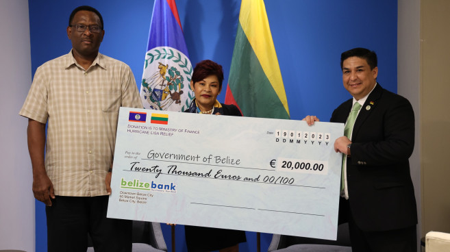 As part of the ongoing efforts by the Ministry of Foreign Affairs, Foreign Trade and Immigration to engage with its bilateral and multilateral partners in securing Hurricane Lisa relief, Belize received a cheque for the equivalent of 20,000 Euros from the people and Government of Lithuania on January 19, 2023.