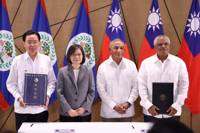 The signing was witnessed by Hon. John Briceño, Prime Minister of Belize, and H.E. Dr. Tsai Ing-Wen, President of the Republic of China (Taiwan).
