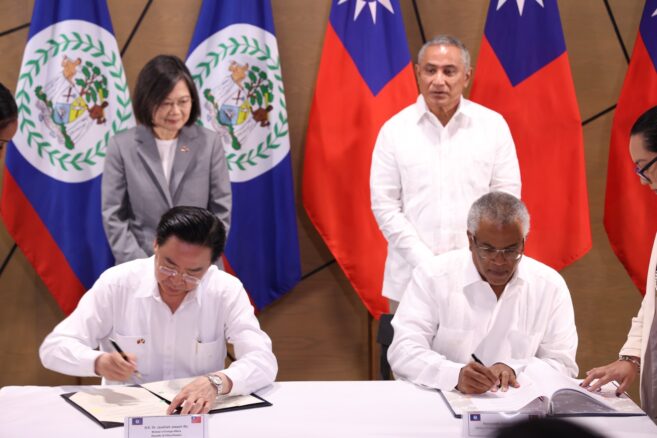 The signing was witnessed by Hon. John Briceño, Prime Minister of Belize, and H.E. Dr. Tsai Ing-Wen, President of the Republic of China (Taiwan).
