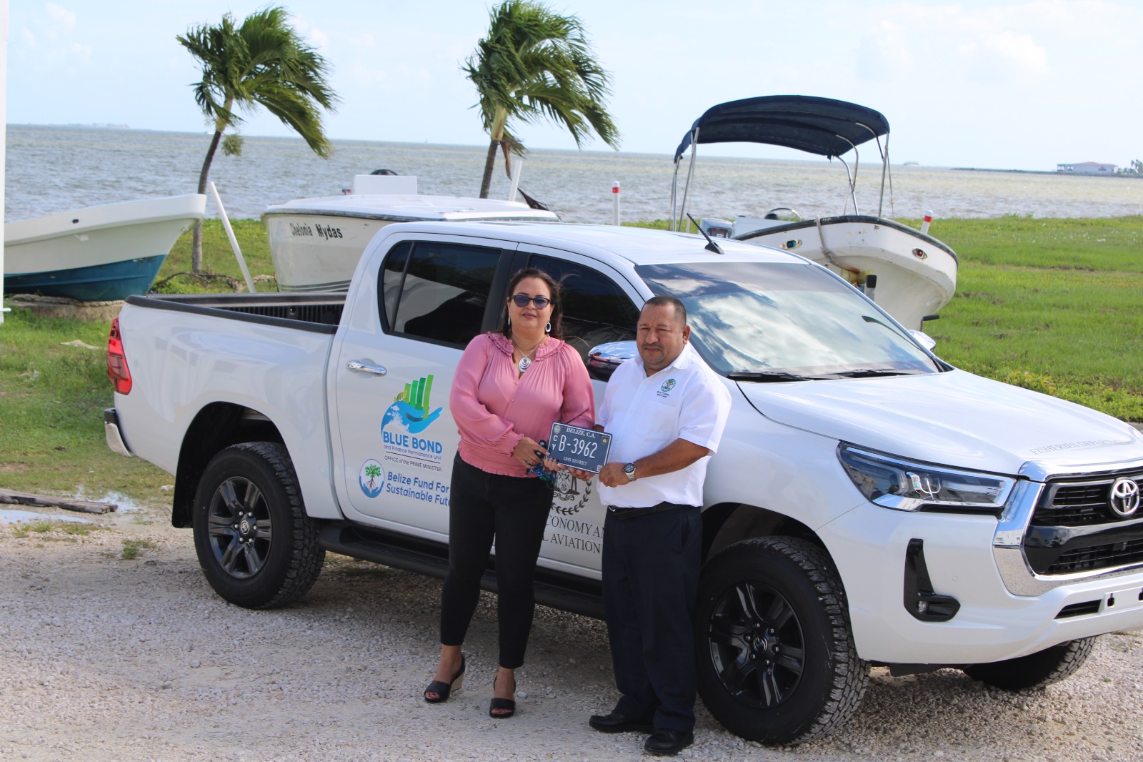 On January 19, 2024, the Blue Bond and Finance Permanence Unit handed over a Toyota Hilux Vehicle and an outboard engine to the Fisheries Department. This donation is valued at BZ$130,040 as part of a larger BZ$11.7 million investment being executed in the framework of the project titled “Establishing the enabling environment for the development of a Marine Spatial Plan through strengthened governance, improved management, and enhanced monitoring of Belize’s coastal and marine resources”. The vehicle was purchased to strengthen the fisheries governance and management effectiveness in Belize’s Blue Space, supporting Belize’s national development goals and Blue Bond commitments.