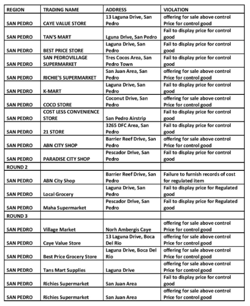 The Supplies Control Unit in the Ministry of Agriculture, Food Security and Enterprise hereby informs the public that a third round of establishment inspections for compliance with provisions of the new Supplies Control (Prices) Regulations was carried out in February 2024. During this period, a total of 35 establishments were issued tickets for violations of the regulations in San Pedro Ambergris Caye and Caye Caulker in the Belize District. The full list of the establishments issued tickets is presented in the table below.