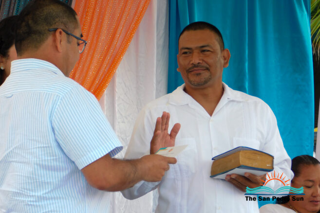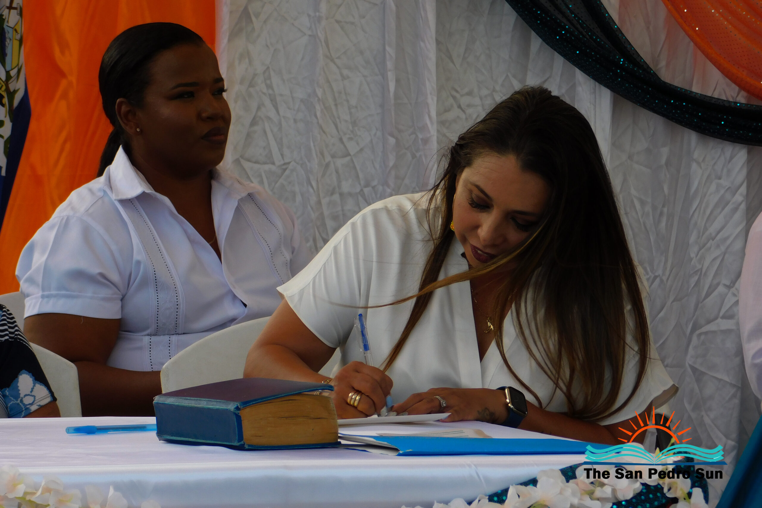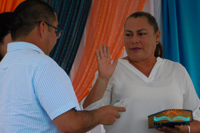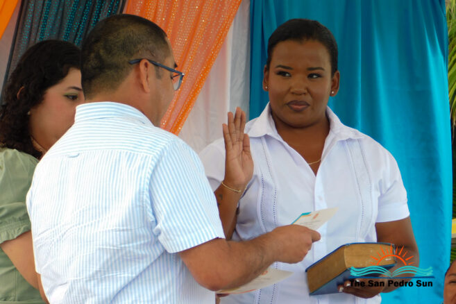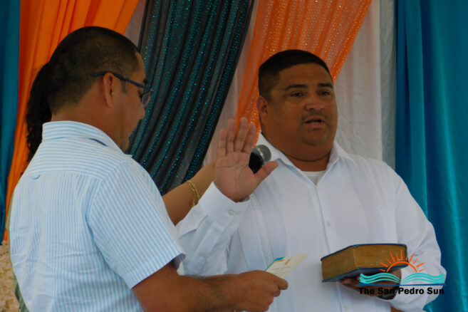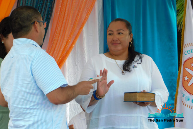 The newly elected candidates, Dianeli “Danni” Aranda, Ernesto Bardalez, Jose “Cas” Castellanos, Marina Kay, Adaly Ayuso, and Johnnia Duarte, then took the stage to swear on the Holy Bible and pledged to serve the best interest of the San Pedro Town municipality.