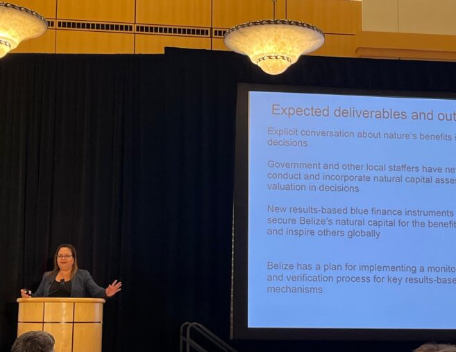 Beverly Wade, Director of the Blue Bond and Finance Permanence Unit, and Leroy Martinez, Acting Director of the Climate Finance Unit, gave presentations on the goals, key actors, activities, outcomes and next steps of the Belize Natural Capital Project. Ms. Wade also participated in a panel discussion on addressing challenges and solutions related to policy, finance, ecosystem services, and pathways to impact policy and finance decisions.