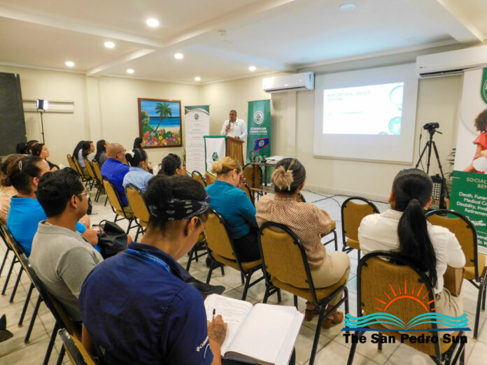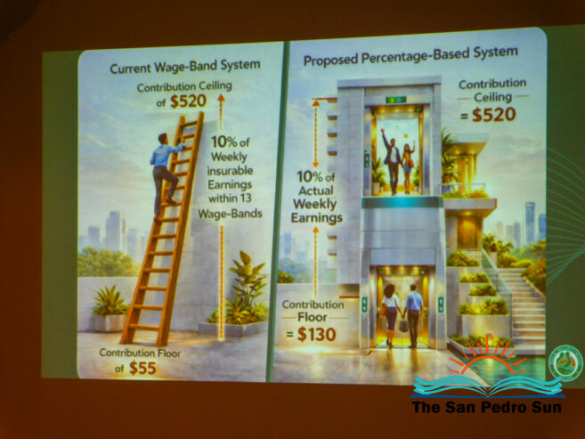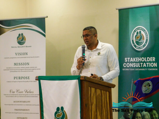 Held at the Sunbreeze Hotel conference room, the session brought together dozens of stakeholders from San Pedro and Caye Caulker. SSB Chief Executive Officer Jerome Palma delivered a comprehensive presentation outlining the proposed amendments. Palma explained that the reforms include shifting from a wage-based system to a percentage-based system that calculates contributions based on actual earnings, as well as increasing the contribution floor. “We have a strategic plan that involves key modernization through legislative changes,” Palma said. “There is a proposal to increase the contribution floor from the current $55 to $130 per week.” He added that this strategic approach is expected to be implemented over the next five years.