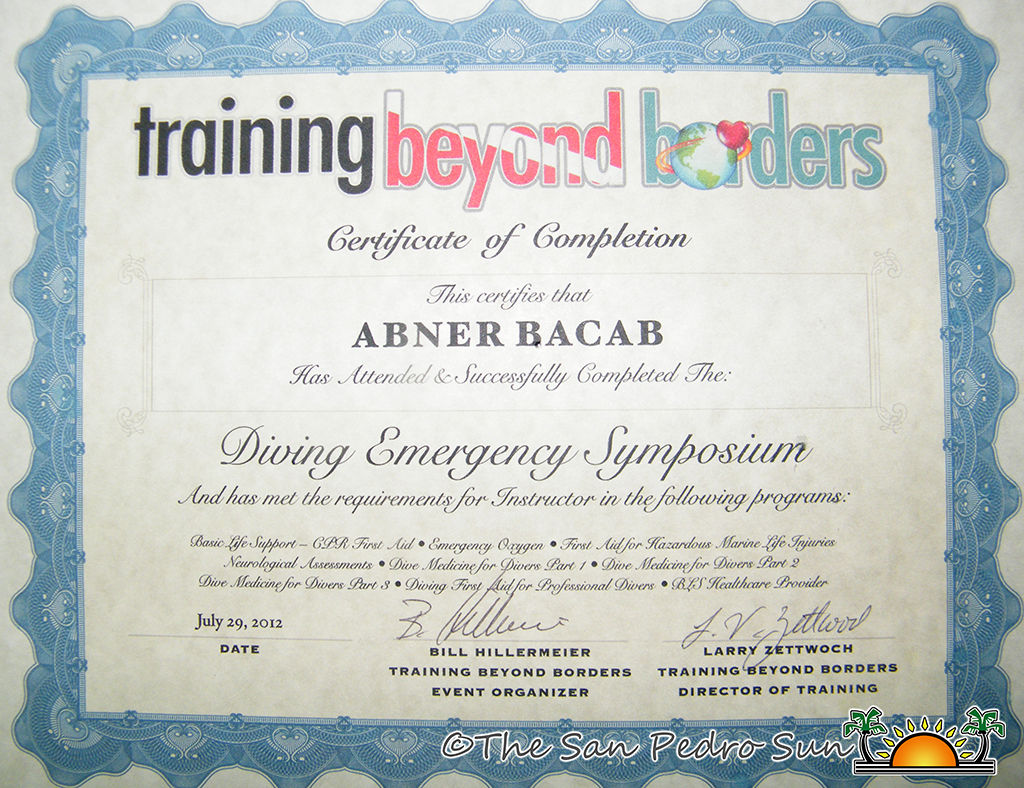 A Belizean living on Ambergris Caye has recently returned to the island newly certified as an Emergency Diving First Aid Instructor. Abner Bacab was certified after he attended a diving emergency symposium offered by Diving Alert Network (DAN) through the Training Beyond Borders program in Cancun, Mexico in July of this year. Bacab becomes the only Belizean living on the island certified as an instructor that can offer Emergency Diving First Aid training in Belize.