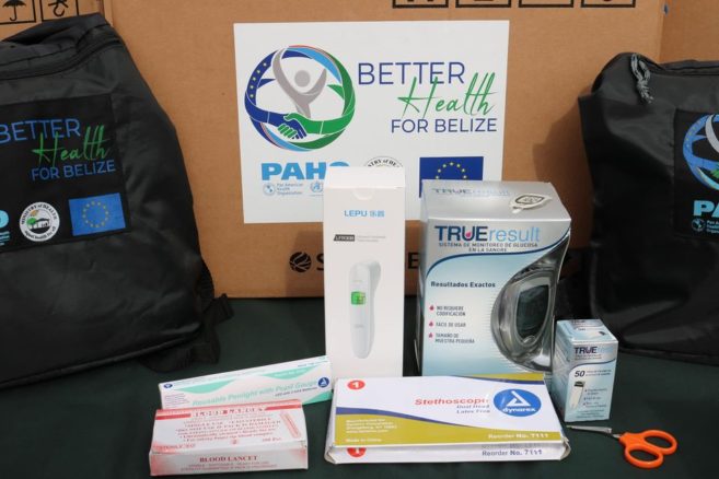 Both the EU, PAHO/WHO, and MoH recognize the need to respond to the demands created by COVID-19 while, at the same time, maintaining access to healthcare, especially for persons suffering from non-communicable diseases like hypertension and diabetes mellitus. The collaborative effort is supporting an initiative that empowers Belize’s team of 230 Community Health Workers (CHW) to provide basic health services such as blood pressure and glucose monitoring. The CHW network constitutes an alternative strategy for the continued delivery of health services during the pandemic. The programme, which involves training and equipping Community Health Workers to conduct outreach in their villages, is today receiving a donation of 230 CHW work kits containing non-contact thermometers, stethoscopes, glucometers with strips and lancets, and first aid kits.