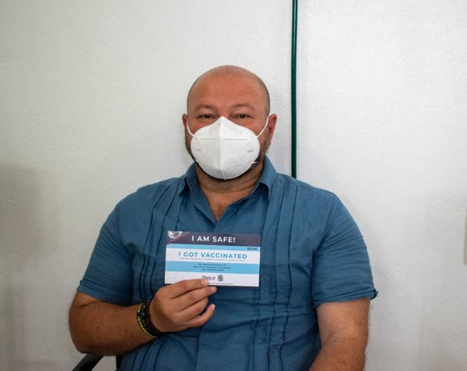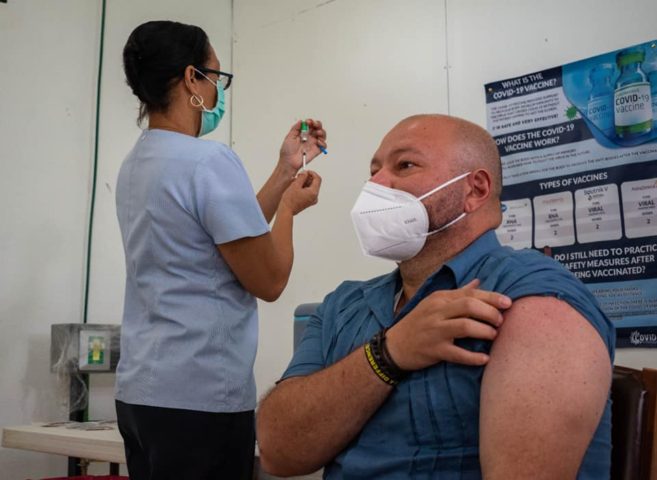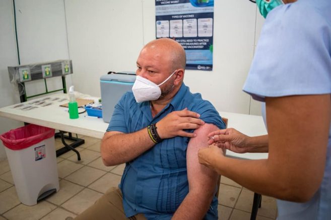 On March 12, 2021, Hon. Michel Chebat, Minister of Health and Wellness, received his first dose of the AstraZeneca COVID-19 Vaccine at the Western Regional Hospital Flu Clinic.