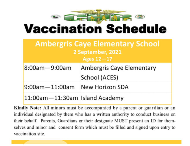 The national vaccination campaign for children ages 12-17 continues on September 2nd in San Pedro Town at the Ambergris Caye Elementary School. This will cover all primary school students from the island ages 12 and up.