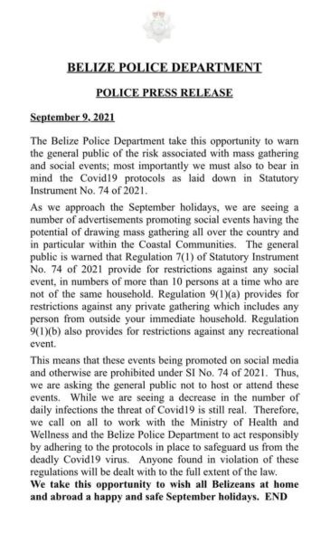 As a result of the third pandemic wave in Belize, police ask the general public not to host or attend any events. “In recent weeks, we see an increase in the number of daily infections; as such, the threat of COVID-19 is still real. Therefore, we call on all to work with the Ministry of Health and Wellness and the Belize Police Department to act responsibly by adhering to the protocols in place to safeguard us from the deadly virus,” part of the police release read. Anyone found in violation of these regulations will be dealt with to the full extent of the law.