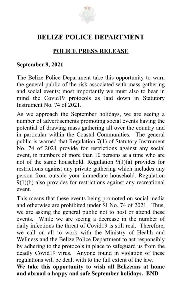 As Belizeans home and abroad get ready to observe the 223rd anniversary of the Battle of St. George’s Caye, everyone is reminded to be cautious as the COVID-19 pandemic is far from over. The anticipated holiday will be observed tomorrow, Friday, September 10th, and considering it is the beginning of a long weekend; the Belize Police Department issued a release warning the public of the risks associated with mass gatherings and social events. The Department reminds every one of the COVID-19 regulations laid down in Statutory Instrument (SI) No. 74 of 2021, which prohibits social gatherings and similar events.