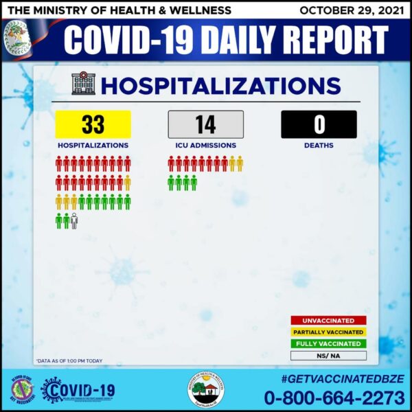 The numbers for October 29th show 173 confirmed cases and 235 recoveries. Compared to the other days, no deaths were reported, and the toll remains at 491. The number of hospitalizations went down from 41 to 33, and 14 remain in the Intensive Care Unit. The most affected continue to be those unvaccinated. Of 33 hospitalized, 19 are unvaccinated, and eight of the patients in the ICU have not received any dose of the vaccine.