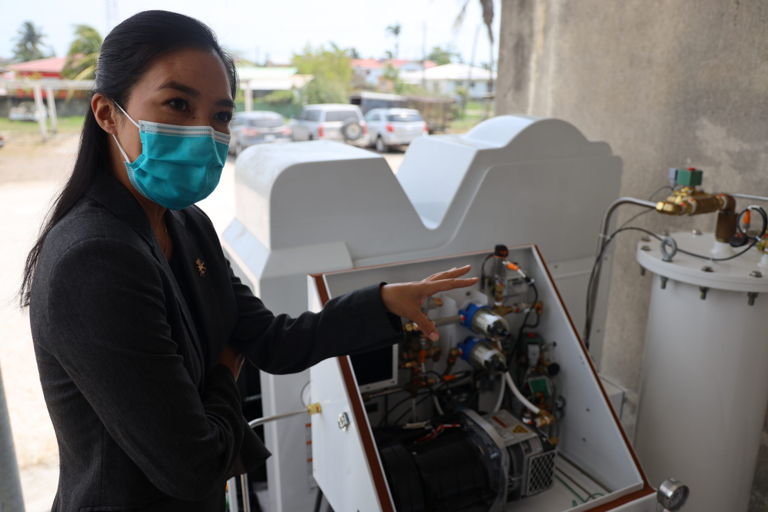 U.S. Ambassador Michelle Kwan visited the Karl Heusner Memorial Hospital (KHMH) to observe hospital staff getting hands on instruction on recently U.S. donated oxygen generators. The three oxygen generators are valued at BZ $1,000,000 and funded through the U.S. Southern Command (SOUTHCOM) Humanitarian Assistance Program, coordinated by the U.S. Embassy Security Cooperation Office.