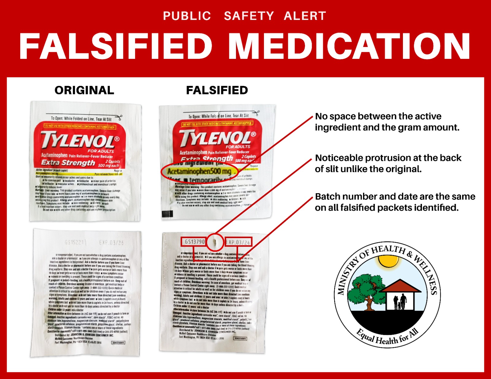 The Ministry of Health & Wellness (MOHW) advises the public that falsified Tylenol has been discovered at various supermarkets across the country.