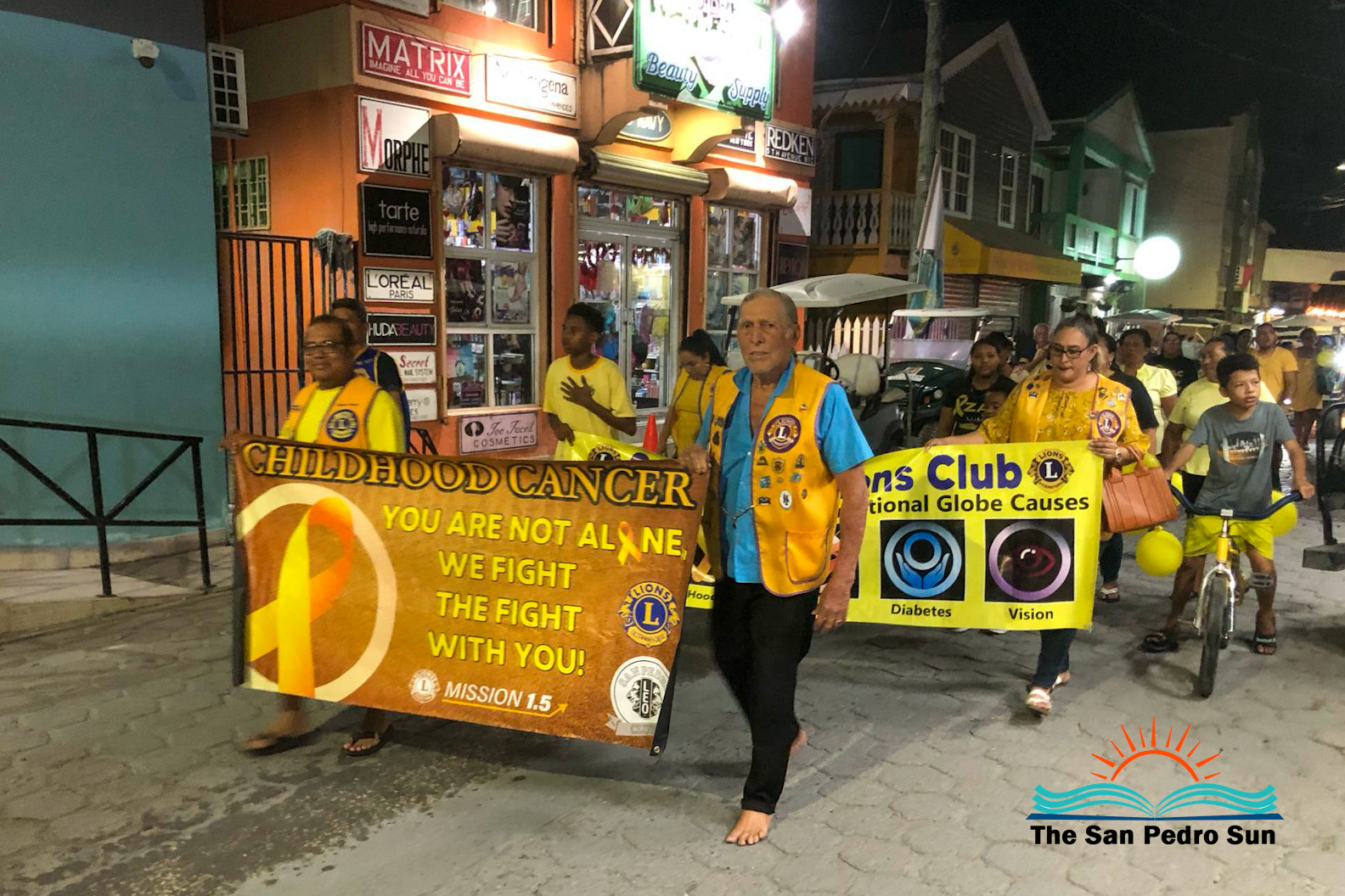 Those participating wore yellow shirts and balloons. They walked up Barrier Reef Drive from Central Park north to San Juan roundabout at 6PM. Then they marched down Pescador Drive until they arrived at Central Park, where they had started. At the end of the activity, Lion Ana Ico, who leads the Childhood Cancer Cause for Lions, presented little Belisle with a pin for fighting and surviving the illness.