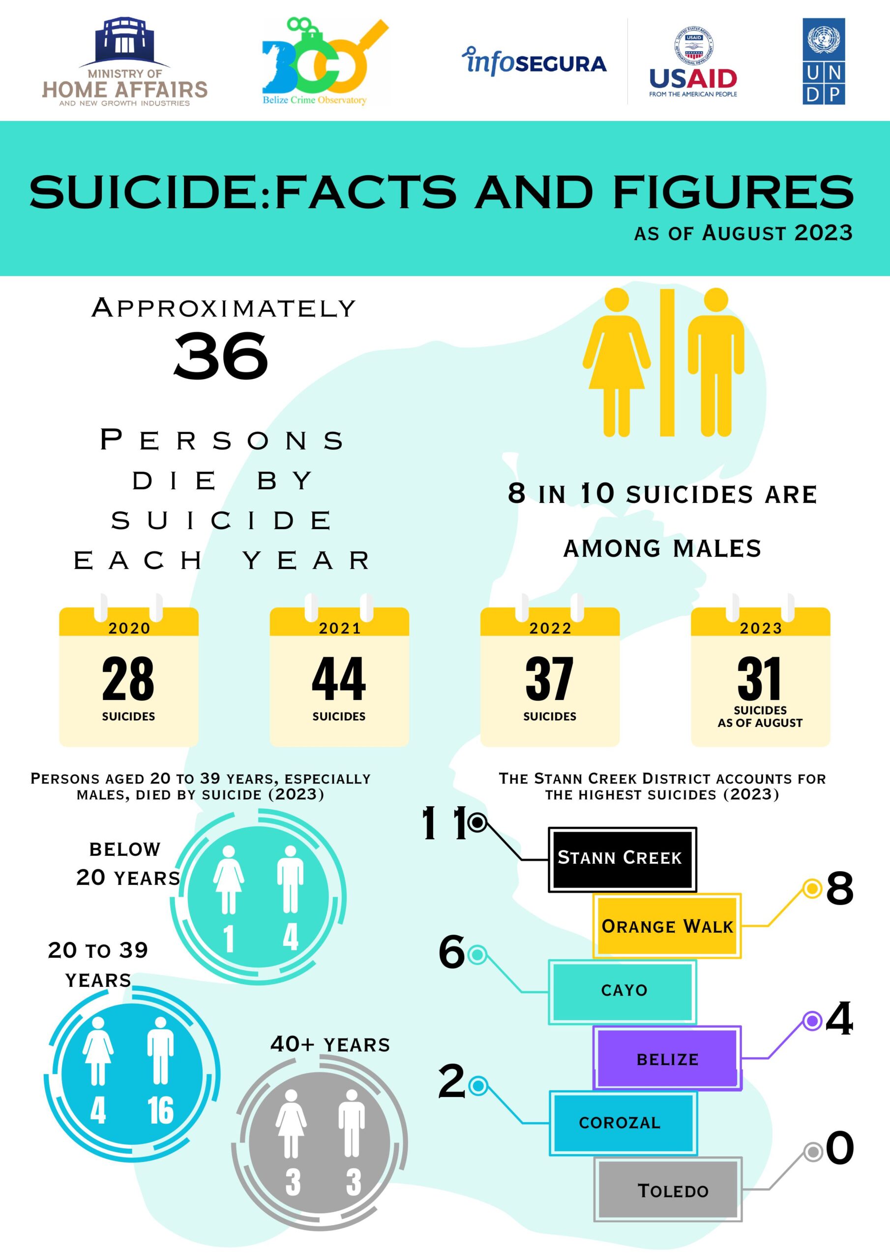 Iveth Quintanilla, the Mental Health Coordinator at MOHW, shared data from a report covering the years 2020 to 2024. According to her findings, young adults aged 18 to 34 are the most affected demographic, making up 59% of all suicide cases during this period. A total of 171 suicides were recorded, with males accounting for 80% (137 cases) and females for the remaining 20% (34 cases). Quintanilla also noted an increase in suicides in 2023, with 46 deaths reported—the highest number in the five years.