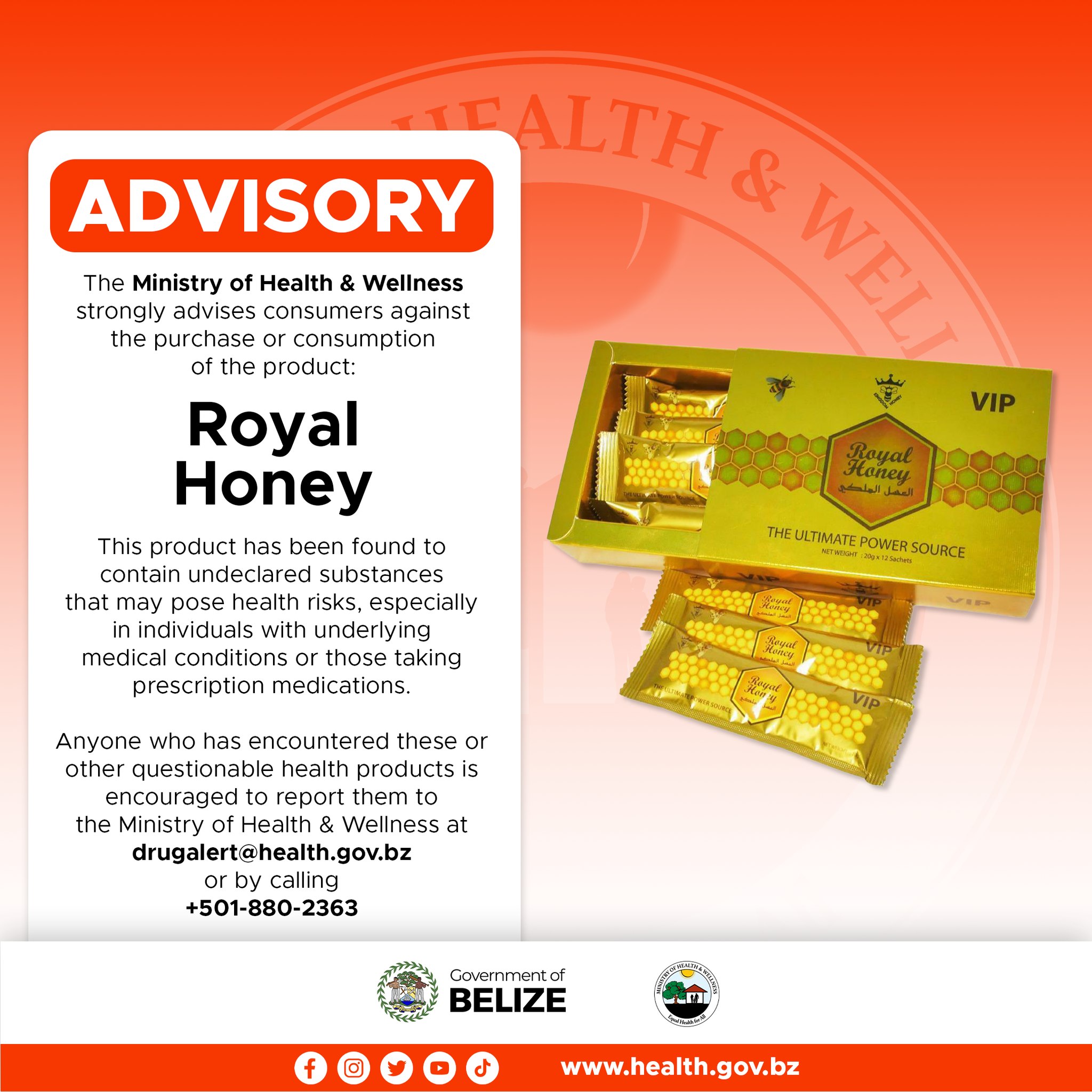 Press Release. Belmopan. June 2, 2025. The Ministry of Health & Wellness (MOHW) is advising the public against the purchase and consumption of a product in circulation labelled as Royal Honey. This is a product marketed for sexual enhancement.