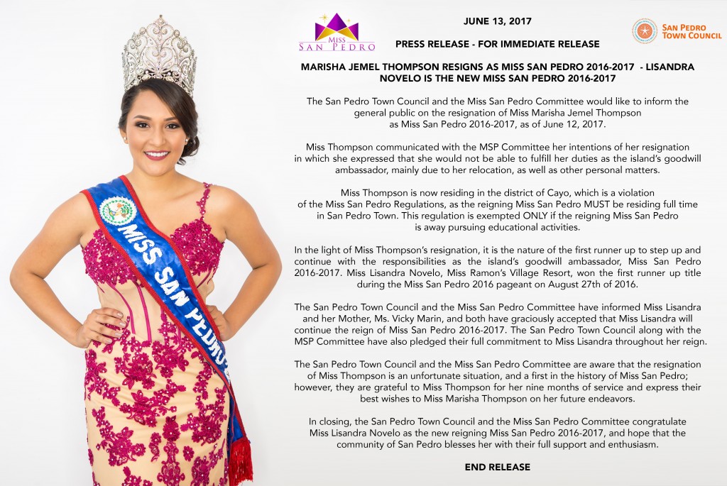 PRESS RELEASE – San Pedro Town Council – June 13, 2017 – The San Pedro Town Council and the Miss San Pedro Committee would like to inform the general public on the resignation of Miss Marisha Jemel Thompson as Miss San Pedro 2016-2017, as of June 12, 2017.