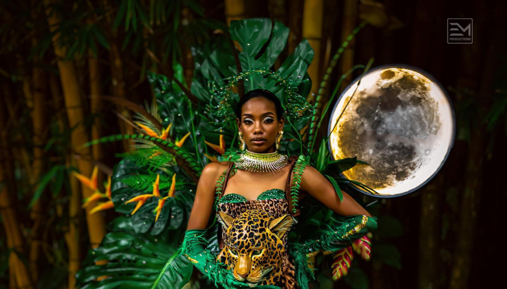 Miss Universe Belize describes the costume depicting the jaguar in its natural habitat glistening under the moonlight. Lightburn is clothed from head to toe in a beaded jaguar print leotard with thigh-high boots accentuated by a tropical flora back piece and a lighted moon, with the jaguar’s head prominently displayed on her body. The detail of the costume compares Lightburn’s onyx eyes with the jaguar’s, penetrating through the darkness to bring light to the young women she mentors.