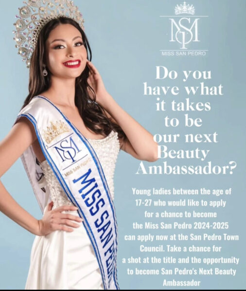 Miss San Pedro 2023-2024, Mariel Calderon, would like to invite young ladies between the ages of 17 and 27 to apply for the position of Miss San Pedro 2024-2025. They can do so at the San Pedro Town Council during office hours from 8AM to 5PM.
