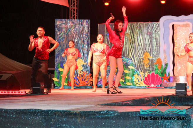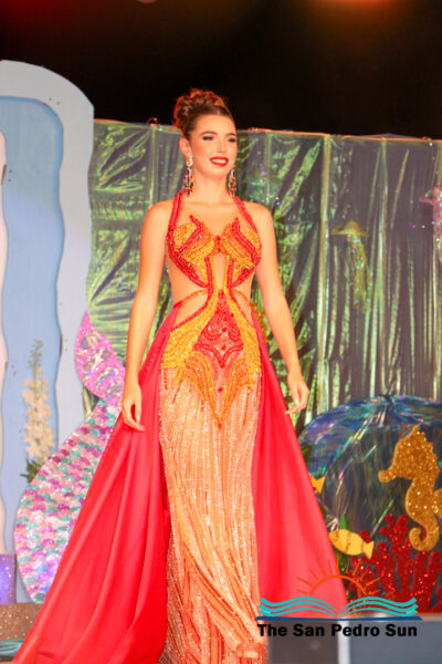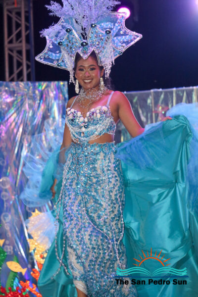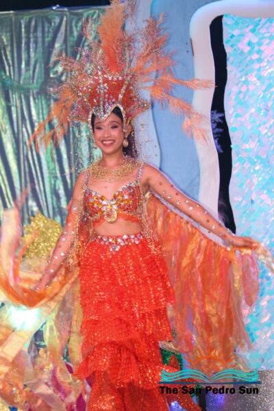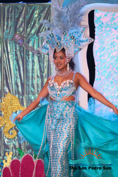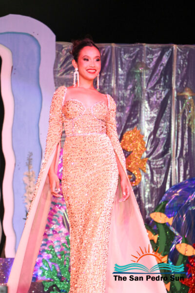 In the costume segment, each contestant showcased elaborate designs inspired by the sea. Chi, sponsored by Ramon’s Village Resort, portrayed the Sea Warrior Goddess. Mas, sponsored by ACRED, represented the Ocean; Neagu, sponsored by Caribeña Enterprises, embodied Creatures of the Sea; Rubio, sponsored by Castillo’s Hardware, highlighted the Coral Reefs; and Sho, sponsored by Re/Max, emphasized the importance of Coastal Waters.