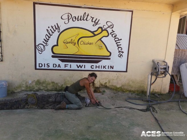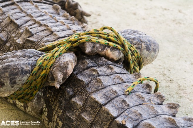 After a bumpy 45-minute ride to Sandhill, Julio was finally on the last leg of his long journey. The exhausted croc was transferred to a tractor-trailer which brought him, at last, to his gorgeous pen. He was unloaded for the final time, placed on the green grass that grew along the bank of the water, and the ropes were removed. You could almost see the joy on his face as he became aware of the crocodile paradise that was his new home. This sanctuary is a place where this old croc can live out his days in peace, basking in the sun, eating chicken, fish, and any other animal unlucky enough to slip into his pen. Having been through many battles in his violent crocodile life – approximately one foot of his tail had been torn off, the majority of his two hind feet are missing and he sustained an in injury at some point that blinded him in one eye – ACES is certain that Julio’s retirement in the sanctuary will be a comfortable one.