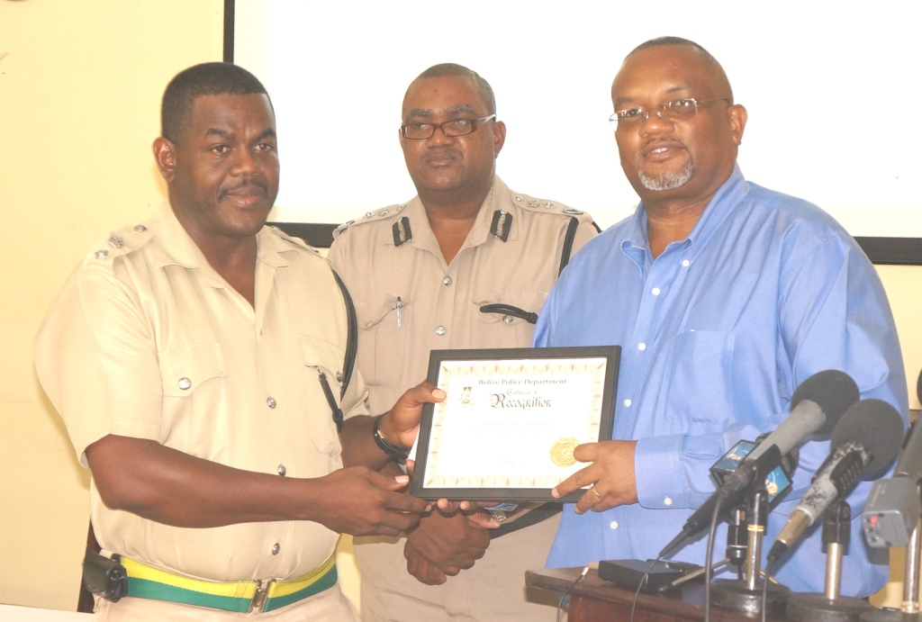 The briefing and award presentation both took place at the start of the Minister and Commissioner’s monthly meeting with zone and branch commanders held at the National Police Training Academy in Belmopan this afternoon