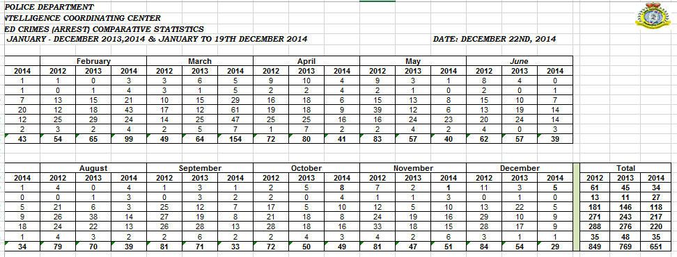 Arrests made for all major crimes, except rape, fell in 2014 when compared to arrests made in 2013. Arrests made in incidents involving rape increased 145.5%, police recorded 42 cases of rape out of which 27 arrests were made in 2014.