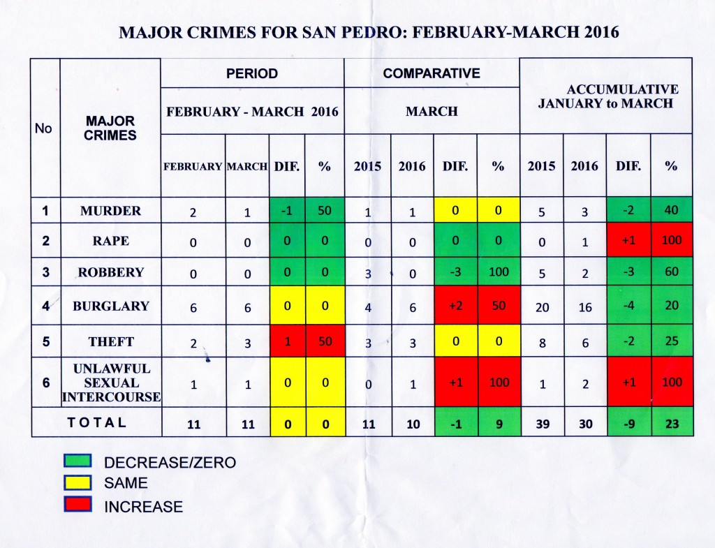 In 2016, the accumulative statistics for January to March indicate that there were nine less major crimes committed than in 2015, a 39% decrease. On the other hand, San Pedro saw an overall increase in rape and unlawful sexual intercourse compared to 2015. Major crimes reported on the island for this quarter include: three murders (decrease of 40%), one rape (increase of 100%), two robberies (decrease of 60%), 16 burglaries (decrease of 20%), six thefts (decrease of 25%) and two incidents of unlawful sexual intercourse (increase of 100%).20 Police Quarterly Statistics010