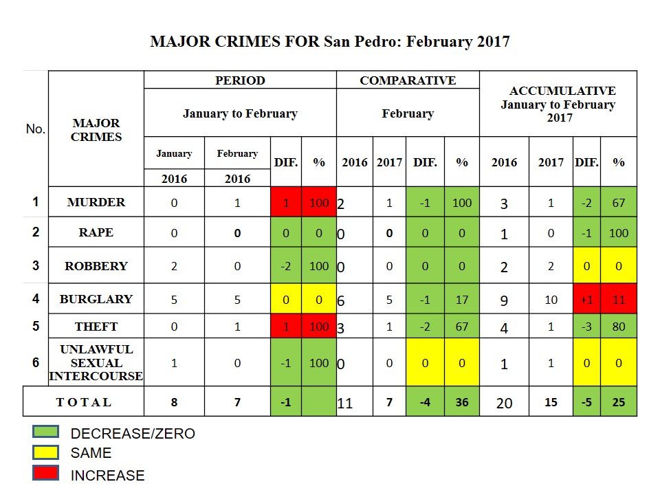 The San Pedro Police Department has released crime statistics for the month of February. There was a steady decrease in major crimes, while burglary recorded higher in the second month of 2017.