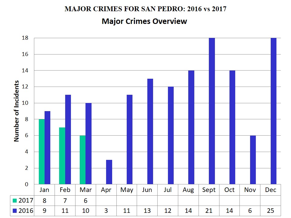 The San Pedro Police Department has released the crime statistics for the month of March. Once again, there was a steady decrease in major crimes, but burglary remains the leading crime in the third month of 2017.
