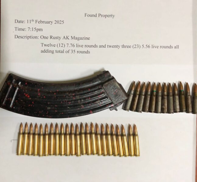 A total of 72 live rounds of ammunition were discovered in northern San Pedro, Ambergris Caye, on Tuesday, February 11th, during a joint operation conducted by a special operations team and various units on the island. The ammunition was found in an AK-47 magazine containing twelve 7.62mm live rounds, a red box holding twenty-three 5.56mm live rounds, and a 60-round magazine containing thirty-seven 5.56mm live rounds. At the time of the findings, no individuals were present in the area.