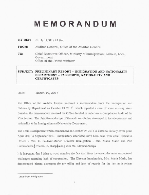 The very first page of the report explains that the Director of Immigration Maria Marin demonstrated disrespect to the AG’s office. “It is very important that I bring to attention the fact that, from the onset, the team encountered challenges regarding the lack of cooperation. The Director of Immigration [Maria Marin], has shown blatant disrespect for my office and lack of regard for the law as it relates specifically to the Finance and Audit Reform Act,” stated the AG’s report. Not only has there been perceived disrespect but accessing documents to conduct the investigation was also painstaking. “The Director, Mrs. Marin, has consistently found ways to evade requests made for the accessing of records.”