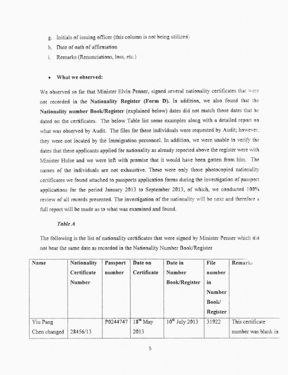 Despite the lack of cooperation and the challenges to access said records, from the bits and pieces of records handed to them, the AG’s report cites that constant and irregular nationality certificates were signed by Minister Penner. “We observed so far that Minister Elvin Penner, signed several nationality certificates that were not recorded in the Nationality Register. In addition, we also found that the Nationality Number Book/Register dates did not match those dates that he dated on the certificate,” explained the report on page five. The AG’s report provided snapshots of some of the people whoPenner granted nationality to, (including passports)that did not meet the minimal requirement.