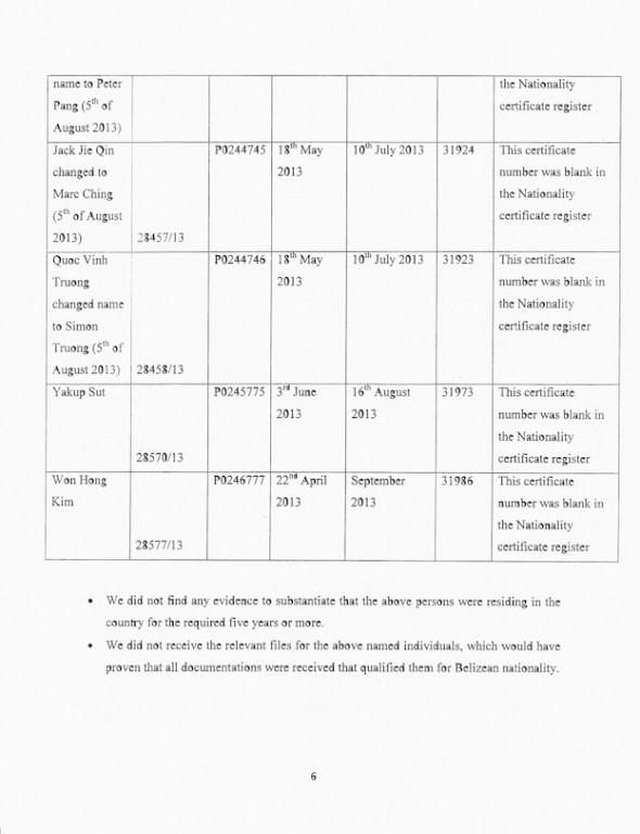 The report went on to explain in detail, how each of the application documentations was pushed through the entire process, starting with junior clerks and senior management staff and ending with the final signature of Minister Penner. Throughout the entire process, gross irregularities were observed and the applications could have been revoked if the proper process was followed. From the list of five that the AG report pointed out, all five applicants received fraudulent Belizean documents without ever setting foot on Belizean soil; yet they received sworn statements from Belizeans, including Justices of the Peace, who stated that they knew the applicants.
