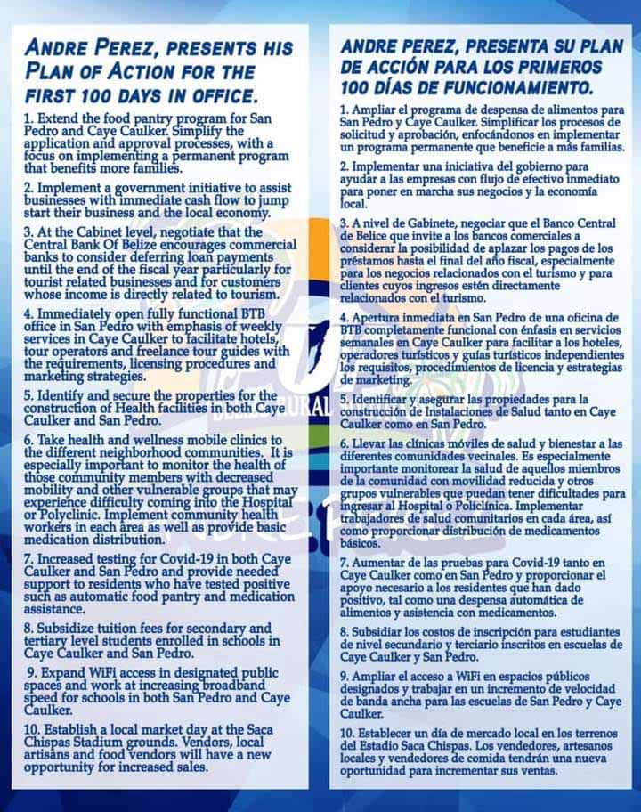 In the list, Perez highlights food pantry programs, health, economy, tourism, identifying properties to construct medical facilities on both Ambergris Caye and Caye Caulker, expand WiFi access, education assistance, and establishing a local market day on Ambergris Caye.