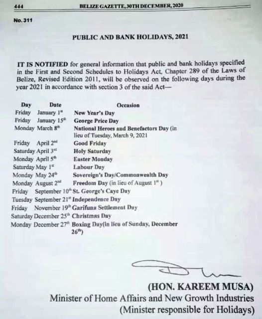 The announcement was officially published in the Belize Gazette on December 30, 2020.