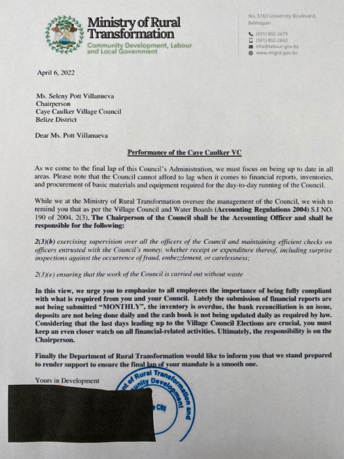 Current Caye Caulker Chairlady Seleny Villanueva-Pott clarified the allegations that her administration has not been performing adequately, particularly in properly reconciling village funds. According to a letter dated April 6, 2022, from the Ministry of Rural Transformation, Community Development, Labor, and Local Government, the Caye Caulker Village Council was urged to comply fully with its duties and submit financial reports monthly. The leaked letter coincides with the Village Council elections taking place this weekend, and Pott claims the information is out of context, and currently, there are no issues in her administration.