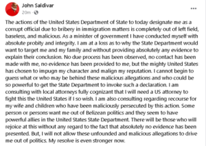 Saldivar used his Facebook account to respond to the notice from the U.S. Department of State. He wrote, “The actions of the United States Department of State today designate me as a corrupt official due to bribery in immigration matters is completely out of left field, baseless, and malicious. As a minister of government, I have conducted myself with absolute probity and integrity. I am at a loss as to why the State Department would want to target me and my family and without providing absolutely any evidence to explain their conclusion. No due process has been observed, no contact has been made with me, no evidence has been provided to me, but the mighty United States has chosen to impugn my character and malign my reputation. I cannot begin to guess what or who may be behind these malicious allegations and who could be so powerful to get the State Department to invoke such a declaration. I am consulting with local attorneys fully cognizant that I will need a U.S. attorney to fight this the United States if I so wish. I am also consulting regarding recourse for my wife and children who have been maliciously persecuted by this action. Some person or persons want me out of Belizean politics, and they seem to have powerful allies in the United States State Department. There will be those who will rejoice at this without any regard to the fact that absolutely no evidence has been presented. But I will not allow these unfounded and malicious allegations to drive me out of politics. My resolve is even stronger now.”