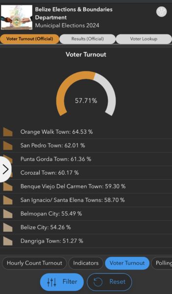 According to information from the Elections and Boundaries in 2021, the voter turnout nationwide was 55%. Despite an increase in 2024 with 57.71% across the country, the turnout was still below expectations. The municipalities with the highest voting participation were Orange Walk Town, 64.53%; San Pedro, 62.01%; and Punta Gorda Town, 61.36%.